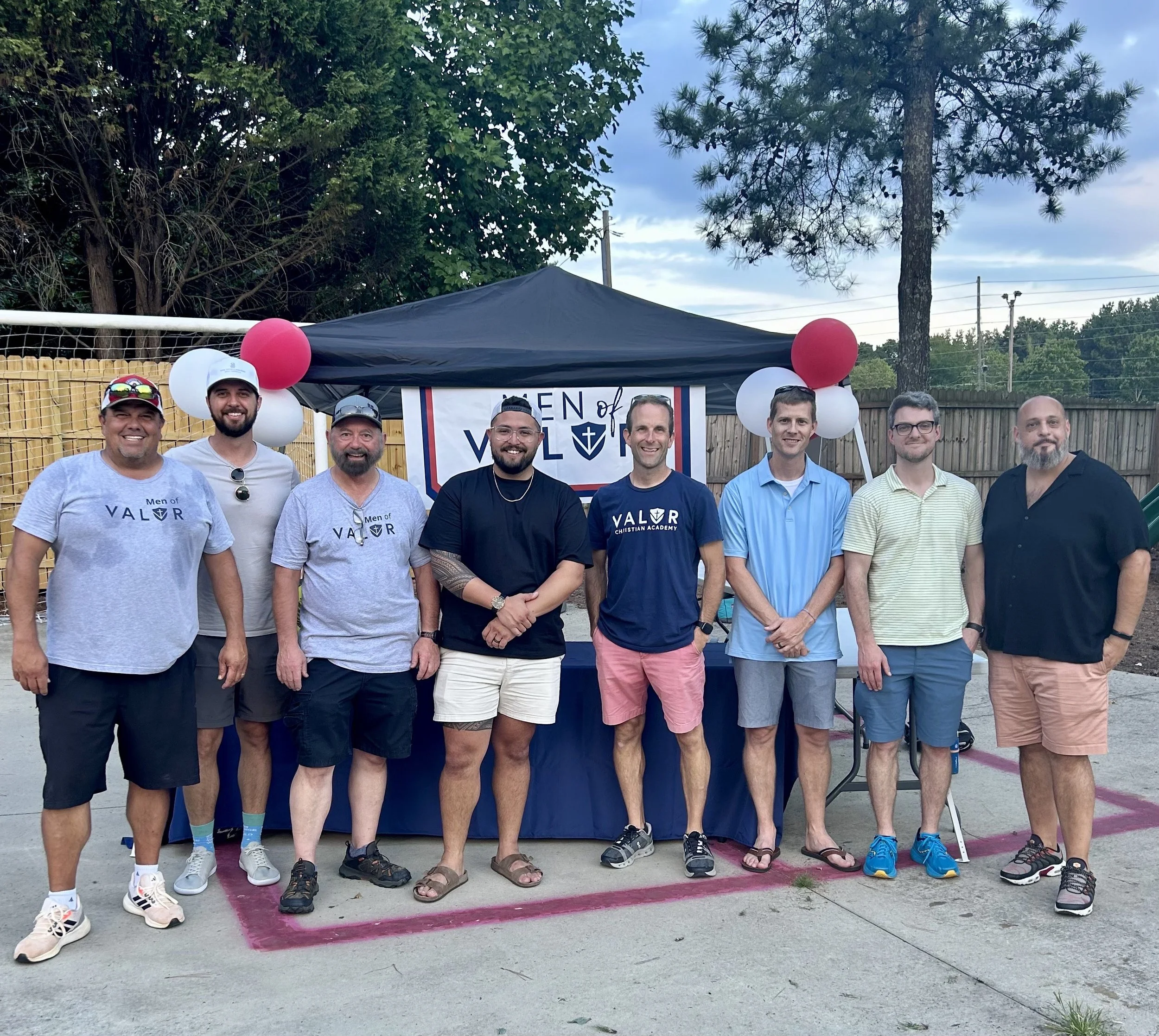 Group of eight men standing outdoors in front of a tent decorated with balloons and a banner that reads 'Men of Valor'. The men are dressed casually, some wearing 'Men of Valor' shirts and others in different t-shirts and shorts.